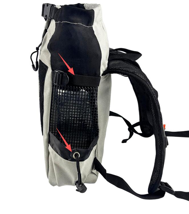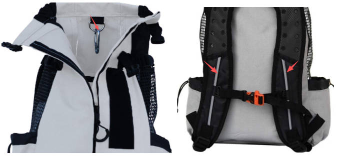 9. מערכת הגנת בטיחות— התרמיל מצויד באבזם בטיחותי למניעת התנתקות, שניתן להשתמש בו בשילוב עם קולר הכלב כדי להבטיח שהכלב יישאר במקומו בצורה בטוחה במהלך בלימת חירום. הפסים המחזירי אור ממוקמים על רצועות הכתף (אינם מכסים את כל התיק) כדי למנוע הפרעה של אור חזק לריכוז הרוכב תוך הבטחת הראות לתנועה המתקרבת.