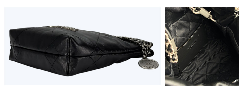 • Chanel 22 Shopping Bag is crafted from lambskin, offering plump, durable leather with a fine texture. The body is soft yet maintains a structured, elegant shape. The interior features a leather and cotton blend, enhancing wear resistance. The hardware is finished with Chanel’s proprietary thick gold matte plating, which is scratch-resistant and anti-oxidation.