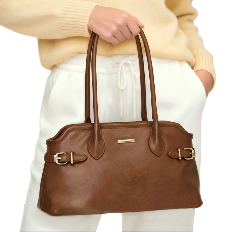 1.38 lbCrafted from high-quality leather, this handbag is structured with a thin layer of foam inside, which helps the bag retain its shape and stand tall. The design includes two stylish leather straps on either side, each accented with metallic buckles, providing both visual appeal and functional design. This leather tote bag is the perfect women’s bag, offering ample space for everyday essentials without sacrificing style.