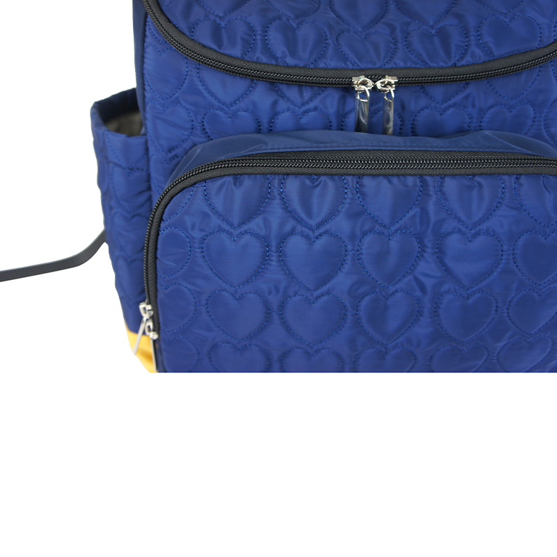 The bag features a charming heart-shaped quilted exterior, crafted from durable navy blue memory PU fabric. The contrasting yellow memory PU fabric on the lower panel and base creates a bold color-block effect, instantly elevating this diaper bag into the category of top diaper bags for modern parents.