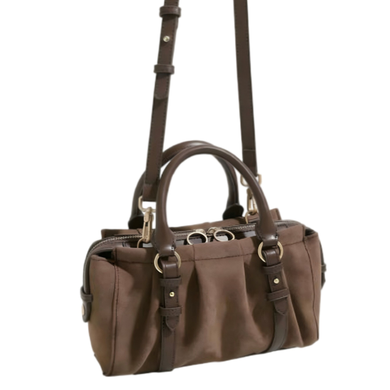 This sophisticated brown suede handbag combines classic design with unique pleated elements to create a timeless accessory. The intricate pleating adds texture and dimension, making it a standout piece in any collection of top handle handbags for women.