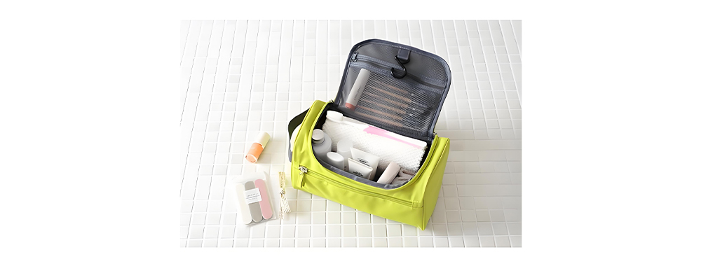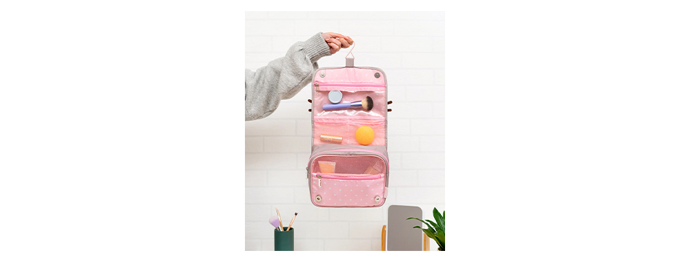 משטחי שירותים במלונות בגודל ממוצע של פחות מ-0.5 מטרים רבועים. תיק האיפור התלוי שלנו, בעל וו מתכת מסתובב ב-360 מעלות, הופך את החלל האנכי לאחסון מאורגן.